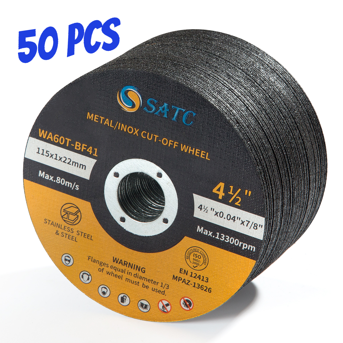 Enjoy a long life and high-quality output with SATC 4-1/2 x 3/64 x 7/8 in Right Angle Type 41 Cut Off Wheels on your grinder. Thinner design minimizes the surface area contact between the material and the cut-off wheels for faster and cleaner cuts. The premium tough aluminum oxide abrasive continuously exposed during use to maintain an aggressive cutting edge and helps getting longer useful life than standard wheels. Fully reinforced with fiberglass mesh for added safety and controlled performance, these wheels are universally suitable for steel and stainless steel (INOX) at an affordable price.